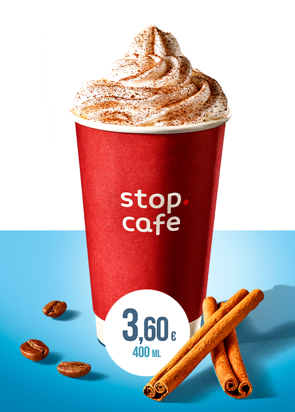 Krémové caffè latte s príchuťou škoricového hniezda a so šľahačkou. Hrejivá škoricová chuť, ktorá vám dodá energiu na cestách.