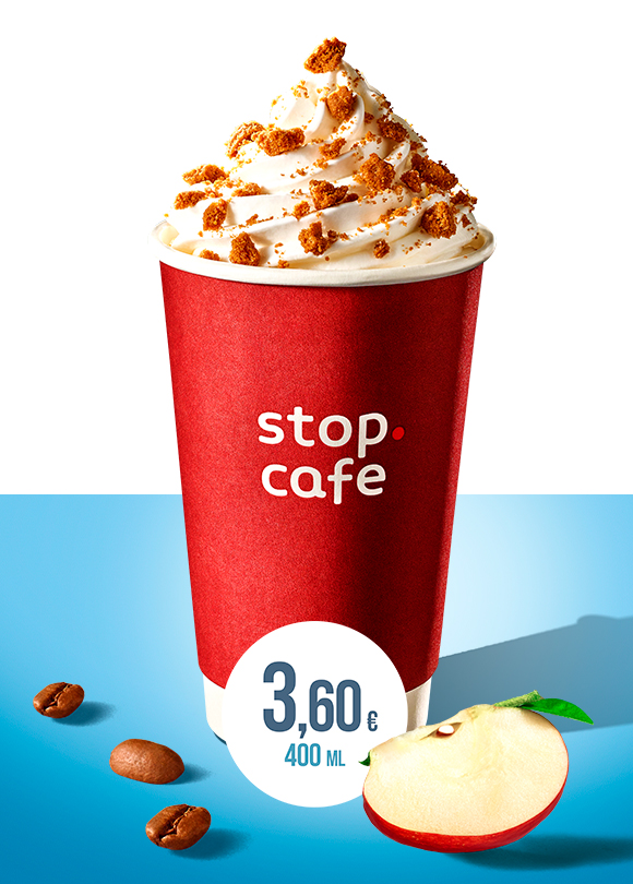 Krémové caffè latte s príchuťou jablčného koláča, šľahačkou a chrumkavou karamelovou sušienkou. Sladká odmena na cestách, ktorá poteší.