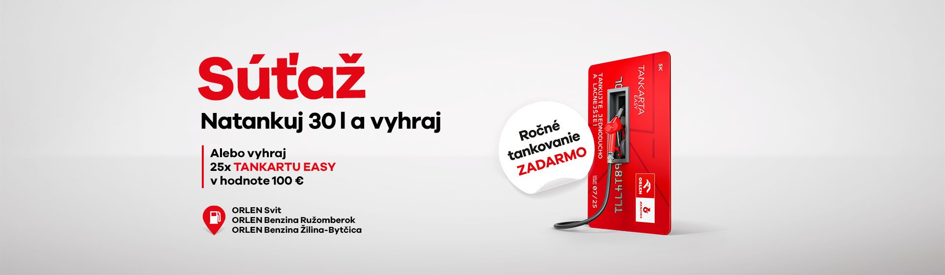 - Natankuj 30l a vyhraj Ročné tankovanie zdarma alebo 25x nabitá TK easy v hodnote 100€ v sieti čerpacích staníc ORLEN Benzina.